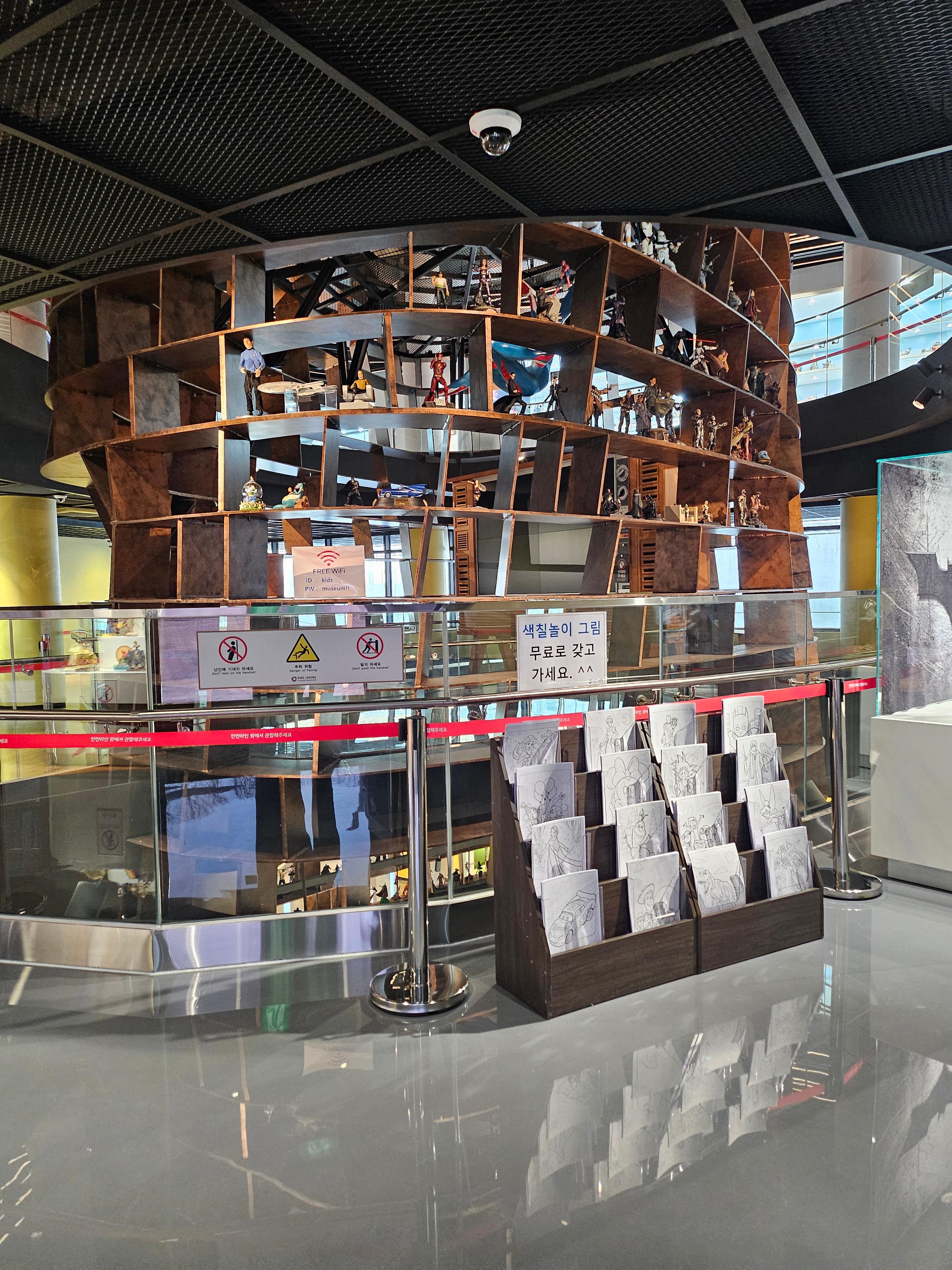특히, 중앙 타워형 전시 구조물과 주변 로비 전시대가 마련되어 있어 관람객들이 이동하면서도 다양한 피규어를 감상할 수 있습니다.